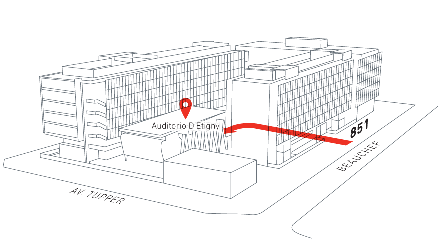Desde la entrada principal por Beauchef 851, ingresa al patio central y camina hacia la izquierda para acceder al Auditorio Enrique d’Etigny por una de las dos escaleras laterales.