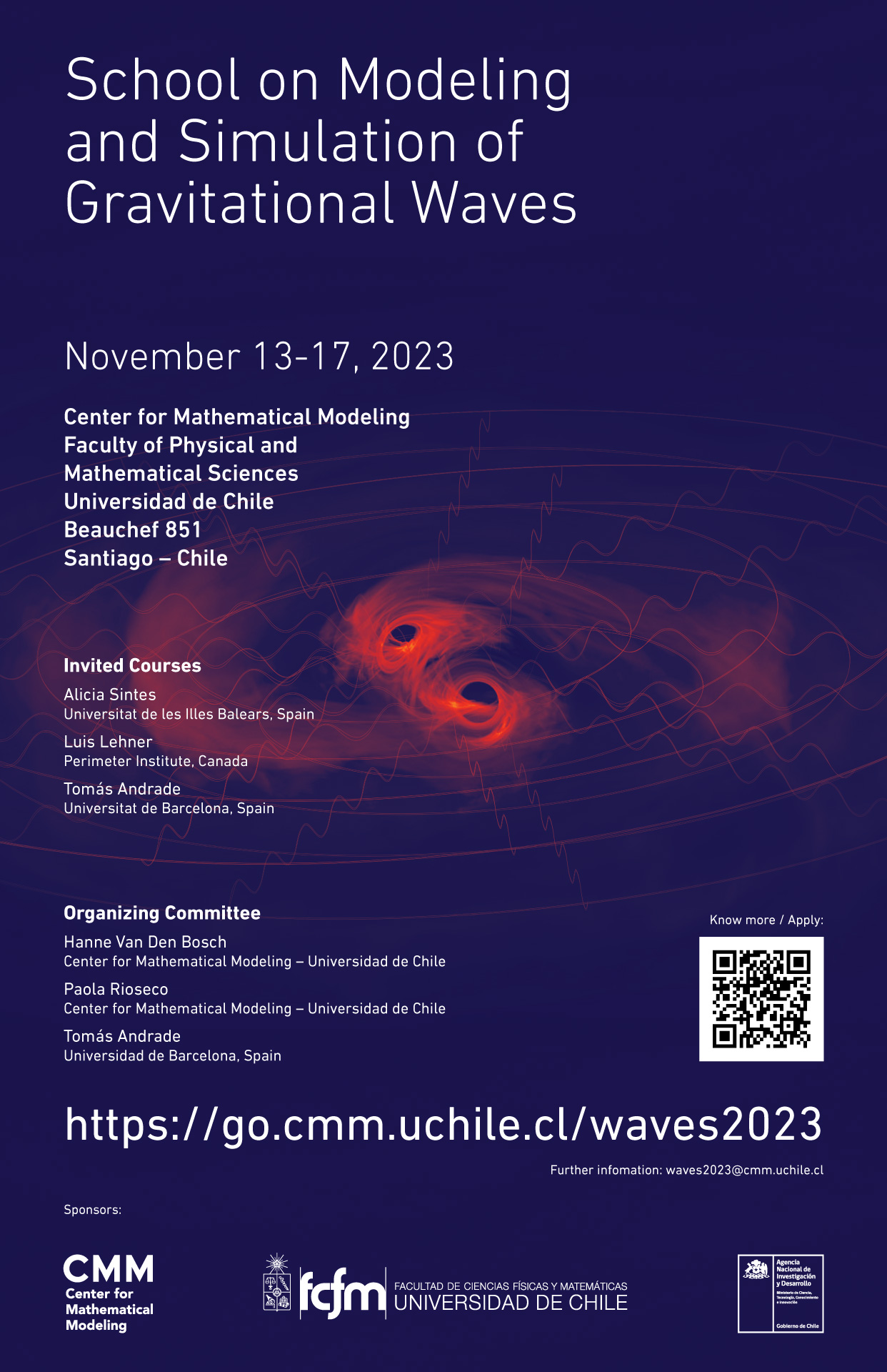 The School on Modeling and Simulation of Gravitational Waves will take place in person at the Center for Mathematical Modeling (CMM), Universidad de Chile, from Monday, November 13 to Friday, November 17, 2023.
